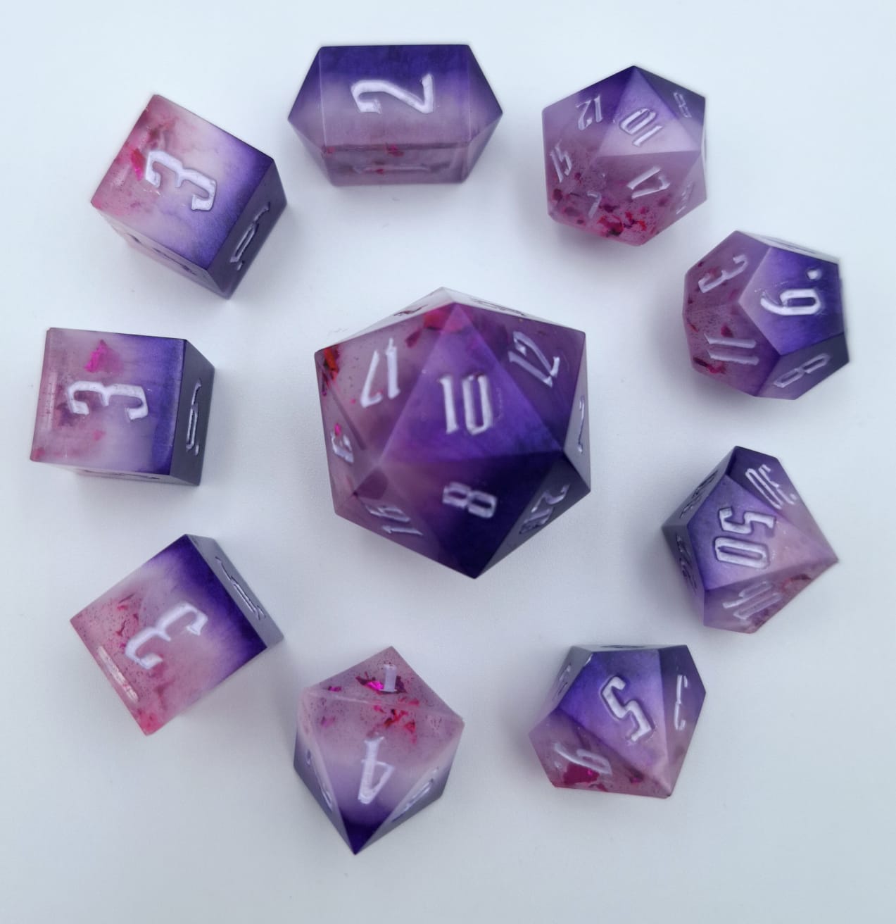 This purple ombré set was made with pink metallic foils, 3 different purples and a white mica. It brings to you a dice that perfectly transitions into one another.